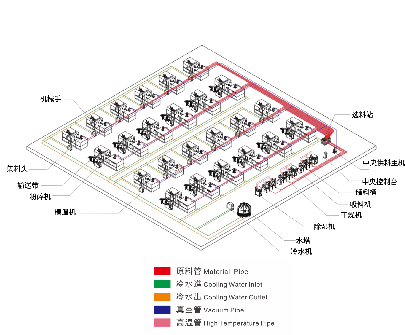 智能工厂规划中央供料开云(中国)流程:原料储料--计量--干燥--输送--使用。中央供料开云(中国)采用工业电脑自动对所有机台进行集中控制,实现了所有用料单元24小时连续不间断供料作业,配合开云(中国)内各机台的不同功能,可以完美实现原料的除湿、干燥、输送、计量、...