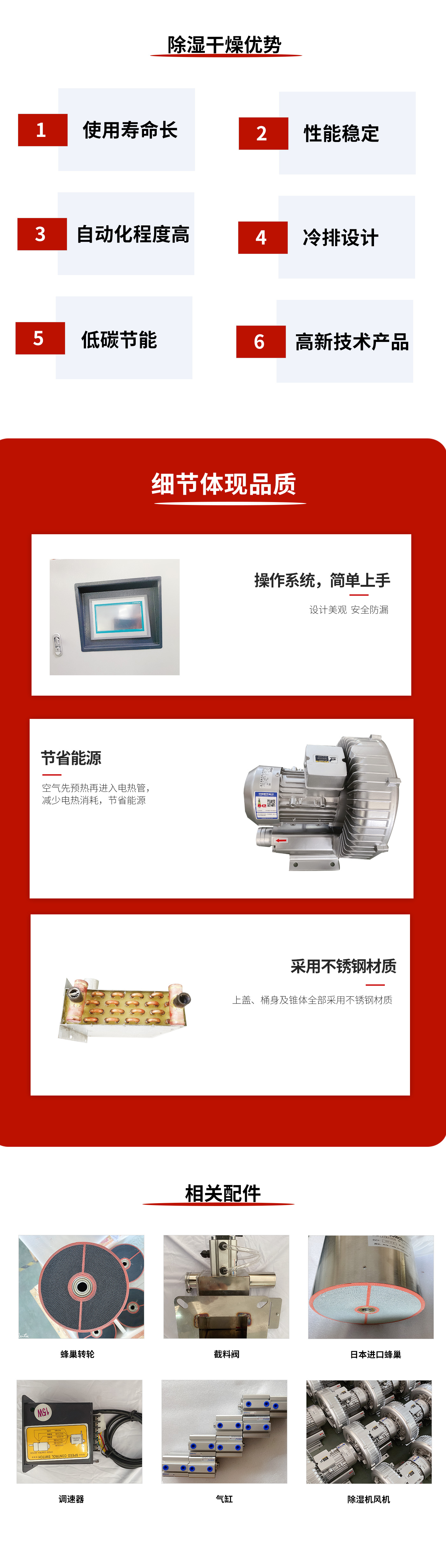 1、采用蜂巢式可清洗陶瓷转轮,长期运转仍不会产生粉屑,可保持原料的洁净度,免除污染,确保产品品质。