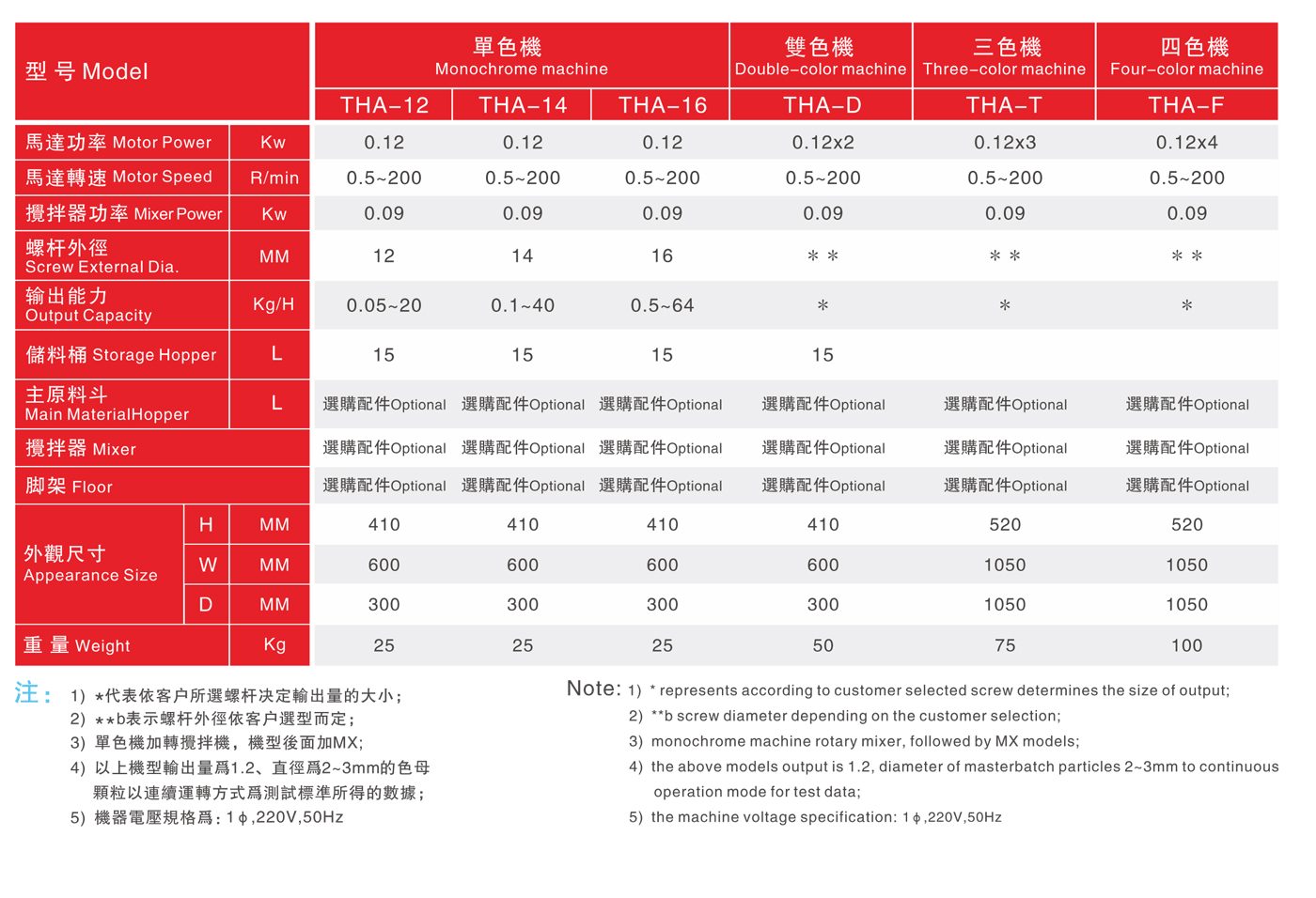 THA-D系列色母机 本机型适用于新料、回收料、色母、添加剂等的自动比例混合。依据预先设定的比例混合,透过微电脑控制开云(中国)设定的条件自动演算出所需之转速( rpm),计量精准。
